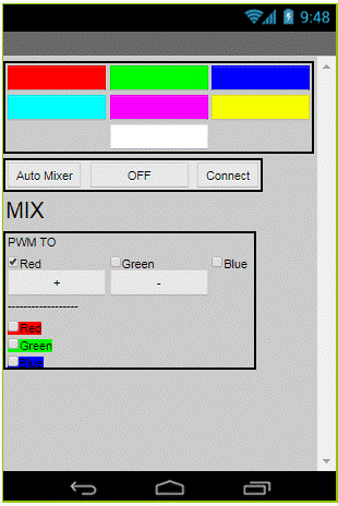 在本節(jié)中,我們將創(chuàng)建一個(gè)安卓應(yīng)用程序,它將監(jiān)測(cè)和顯示用戶的控件選擇。界面由兩部分組成:第一部分包含一組具有預(yù)定義顏色的按鈕,因此當(dāng)按下這些按鈕中的任意一個(gè)時(shí),相應(yīng)顏色的LED會(huì)亮起。第二部分(MIX方塊)為用戶創(chuàng)建混合顏色。