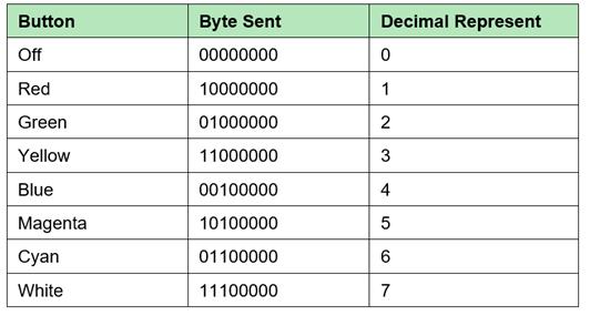前三個(gè)bit:B0、B1和B2將通過預(yù)定義顏色的按鈕在直接控制模式下保持RGB LED的狀態(tài)。因此,當(dāng)單擊其中任意一個(gè)按鈕時(shí),將發(fā)送該按鈕的相應(yīng)值,如表2所示。