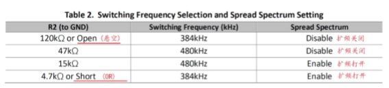 ACM3128A pin6(FREQ/SS)用來設(shè)置開關(guān)頻率以及擴頻模式,接一個電阻到地,不同電阻 對應(yīng)不同開關(guān)頻率以及擴頻是否打開,四個模式。