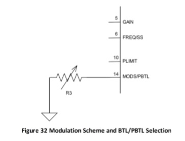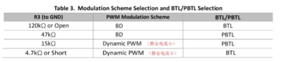 3. pin14 AD52090 pin14(PBTL)用來設(shè)置雙聲道(BTL)以及單聲道(PBTL)工作模式。 低電平:雙聲道(BTL); 高電平:單聲道(PBTL) ACM3128A pin14(MODS/PBTL)用來設(shè)置調(diào)制模式以及雙聲道(BTL)以及單聲道(PBTL)工 作模式。接一個電阻到地,不同電阻對應(yīng)四個模式。
