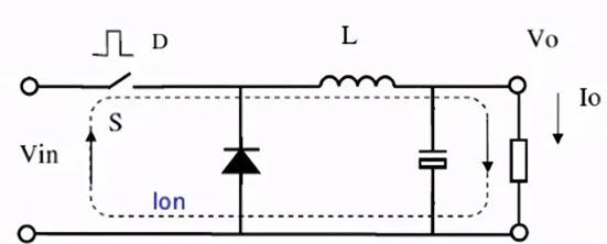 當(dāng)開關(guān)導(dǎo)通時:輸入電壓Vin加到LC濾波器的輸入端,電感上的電流以固定斜率線性上升。如下圖