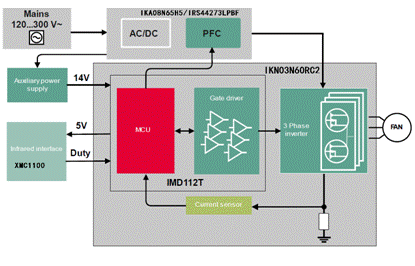 此外,方案中還包括了PFC電路,其在功率器件的選型上,采用8A 650V TRENCHSTOP™5 H5 IGBT IKA08N65H5、IRS44273L柵極驅(qū)動器、逆變器采用3A 600V逆導(dǎo)型IGBT IKN03N60RC2。得益于這些器件,本方案能夠以極低的系統(tǒng)和開發(fā)成本為任何吊扇系統(tǒng)提供參考。