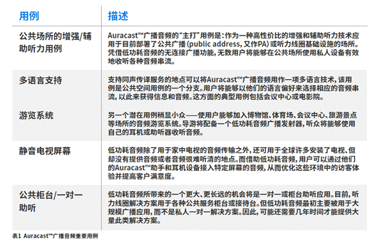 如下面的表1所示,藍牙技術(shù)聯(lián)盟確定了五個主要的初始Auracast™廣播音頻用例。隨著市場的發(fā)展和Auracast™廣播音頻設(shè)備安裝量的增加,市場上很可能會出現(xiàn)其他具有吸引力的新用例。