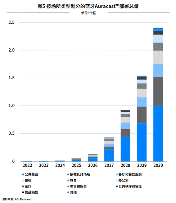 隨著新建筑數(shù)量的增長,到2030年這個數(shù)字將增加到6,400萬。但正如圖4所示,低功耗音頻源和接收設(shè)備生態(tài)系統(tǒng)的發(fā)展需要一些時間。ABI Research預(yù)計主要的拐點將在2025年左右出現(xiàn), 之后將有額外的激勵措施鼓勵場所開始部署Auracast™廣播音頻。到那時,場所將更加熟悉這 項技術(shù),發(fā)射器設(shè)備將更容易獲得,支持低功耗音頻的設(shè)備安裝數(shù)量也將達到臨界值。因此,ABI Research預(yù)測,在未來十年,Auracast™廣播音頻解決方案的部署速度會變得更快。
