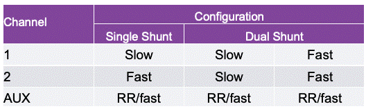 為了簡(jiǎn)化設(shè)置,監(jiān)視器的五個(gè)ADC形成三個(gè)數(shù)據(jù)采集通道。每個(gè)通道可以配置為兩種速度之一,具體取決于應(yīng)用,如表 1 所示。例如,兩個(gè)通道可用于監(jiān)控單個(gè)分流電阻器:一個(gè)通道用于慢速(100 ms)高精度電流、功率、電荷和能量測(cè)量;另一個(gè)用于快速(782 μs)電流快照,與電池組電壓測(cè)量同步,用于阻抗跟蹤或預(yù)充電測(cè)量;蛘撸ㄟ^(guò)兩個(gè)獨(dú)立通道監(jiān)控的兩個(gè)不同尺寸的分流電阻(如圖2所示),允許用戶平衡每個(gè)分流器的精度和功率損耗。同時(shí),第三個(gè)輔助通道可以對(duì)可選緩沖輸入進(jìn)行快速測(cè)量,也可以對(duì)兩個(gè)可配置輸入(堆棧電壓、芯片溫度、電源電壓和基準(zhǔn)電壓)進(jìn)行自動(dòng)循環(huán)(RR)測(cè)量。