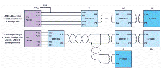 標(biāo)準(zhǔn)SPI接口可用于直接MCU連接,isoSPI接口提供標(biāo)準(zhǔn)芯片級(jí)SPI的物理層適配,釋放出經(jīng)濟(jì)高效的分布式封裝架構(gòu)的全部潛力。isoSPI 專為高電壓和高噪聲系統(tǒng)而設(shè)計(jì),僅使用一根雙絞線電纜和一個(gè)簡(jiǎn)單的脈沖變壓器,即可在長(zhǎng)達(dá) 100 米的電纜上提供高達(dá) 1 Mbps 的安全、可靠的信息傳輸。isoSPI也比其他板載隔離解決方案便宜。圖3顯示了如何利用isoSPI作為菊花鏈或可尋址并行配置中的最后一個(gè)元件的架構(gòu)。