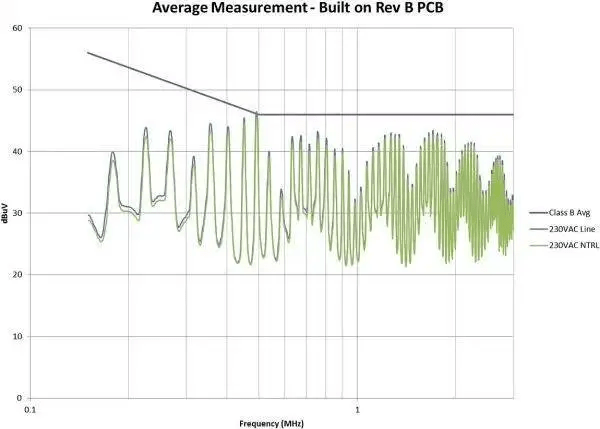 這是一條令人關注的曲線,因為它反映出了幾個問題:明顯超出了規(guī)范要求的較低頻率輻射、共模問題通常很明顯的1MHz至2MHz組件,以及較高頻率組件的衰減正弦(x)/x分布。需要采取措施讓輻射不超出規(guī)范。我們利用通用電容公式將其降低了: