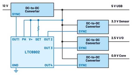 圖3顯示了圖1中采用LTC6902多相振蕩器的電源架構(gòu)。它由5V電壓供電。該電壓由一個(gè)將12V轉(zhuǎn)換為5V的降壓轉(zhuǎn)換器產(chǎn)生。對(duì)于開關(guān)穩(wěn)壓器,如果它們首先使用自己的內(nèi)部振蕩器獨(dú)立啟動(dòng),然后再提供外部時(shí)鐘,則一般不會(huì)有問題。詳細(xì)信息可在相應(yīng)開關(guān)穩(wěn)壓器的數(shù)據(jù)手冊(cè)中找到。