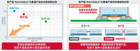 新產(chǎn)品采用融入了ROHM自有IC工藝的晶圓級(jí)芯片尺寸封裝*2DSN1006-3(1.0mm×0.6mm),在實(shí)現(xiàn)小型化的同時(shí)還降低了功耗。與相同封裝的普通產(chǎn)品相比,表示導(dǎo)通損耗和開關(guān)損耗之間關(guān)系的指標(biāo)(導(dǎo)通電阻*3×Qgd*4)改善了20%左右,達(dá)到業(yè)內(nèi)先進(jìn)水平(1.0mm×0.6mm以下封裝產(chǎn)品比較),非常有助于縮減各種小型設(shè)備電路板上的元器件所占面積并進(jìn)一步提高效率。另外,還采用ROHM自有的封裝結(jié)構(gòu),使側(cè)壁有絕緣保護(hù)(相同封裝的普通產(chǎn)品沒有絕緣保護(hù))。在受空間限制而不得不高密度安裝元器件的小型設(shè)備中,使用這款新產(chǎn)品可降低因元器件之間的接觸而導(dǎo)致短路的風(fēng)險(xiǎn),從而有助于設(shè)備的安全運(yùn)行。