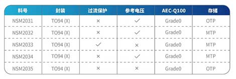 NSM203x產(chǎn)品系列包含了5個(gè)產(chǎn)品型號(hào),即NSM2031、NSM2032、NSM2033、NSM2034和NSM2035?紤]過流保護(hù)輸出、參考電壓輸出、存儲(chǔ)器類型(單次可編程OTP、可重復(fù)編程MTP)、封裝形式等多個(gè)維度,NSM203x系列可以全面覆蓋各個(gè)應(yīng)用場(chǎng)景下的不同系統(tǒng)需求。各產(chǎn)品類型均有車規(guī)和工規(guī)型號(hào),其中車規(guī)級(jí)別產(chǎn)品滿足AEC-Q100 Grade 0的可靠性要求,可在-40~150℃的嚴(yán)苛環(huán)境下勝任工作。