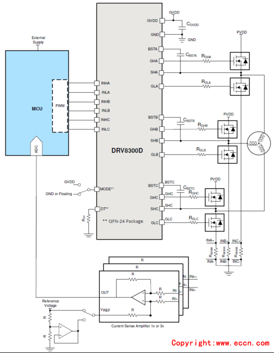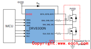 MOSFETs. The DRV8300N generates the correct gate drive voltages using an external bootstrap diode and external capacitor for the high-side MOSFETs.