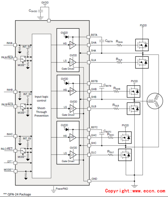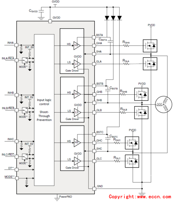 which further improves efficiency. Undervoltage protection is provided for both low and high side through GVDD and BST undervoltage lockout.