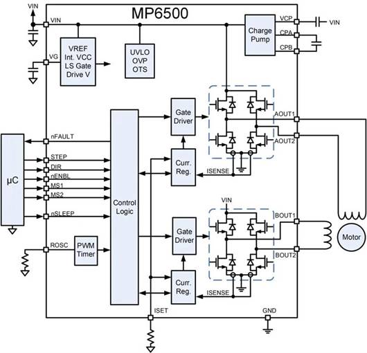 使用 MPS 的MP6500步進(jìn)電機(jī)驅(qū)動器 IC進(jìn)行了兩個類似的實驗。MP6500 驅(qū)動器 IC 使用的 PWM 電流調(diào)節(jié),可以從整步到 1/8 步運行。圖 7顯示了 MP6500 的框圖。