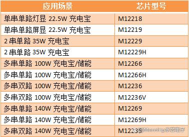 除了M12269這款明星產(chǎn)品外,MERCHIP水芯電子還推出了從22.5W-140W的完整快充充放電平臺(tái)。該系列芯片中的M12239等芯片可以支持兩路獨(dú)立快充,實(shí)現(xiàn)筆記本和手機(jī)同時(shí)快充。也可以多顆芯片并聯(lián)輕松實(shí)現(xiàn)多口快充充放電的復(fù)雜系統(tǒng)設(shè)計(jì)。該芯片家族包括以下成員: