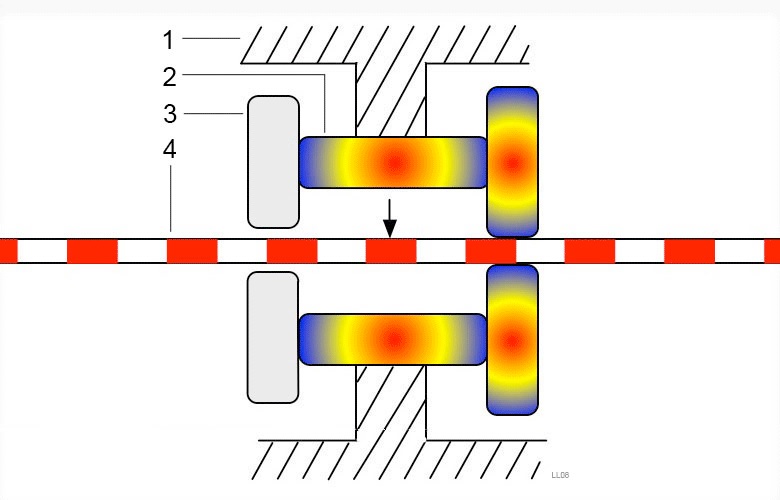 圖 3 壓電電機(jī)可以像尺蠖一樣以微小的增量向前爬行,在通電和斷電方面有適當(dāng)?shù)膴A緊和松開時(shí)機(jī)(1:外殼,2:移動(dòng)晶體,3:鎖定晶體,4:旋轉(zhuǎn)部分) . 資料:維基百科用戶LaurensvanLieshout