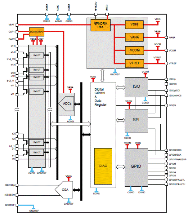 此外,器件中包含的隔離式雙向菊花鏈端口支持通過電容器和變壓器進行隔離,并且能夠使用更高效的組件實現(xiàn)xEV動力總成系統(tǒng)中常見的集中式或分布式架構。在通信線路中斷的情況下,菊花鏈通信接口可配置為環(huán)形架構,允許主機與堆棧兩端的設備通信。器件中的8個GPIO或輔助輸入可執(zhí)行外部熱敏電阻測量。