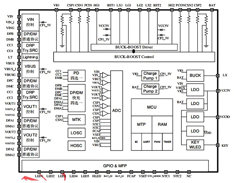 IP5389 是一款集成 QC2.0 / QC3.0 / QC3+輸出快充協(xié)議,AFC/FCP/ SCP/ VOOC 輸入輸出快充協(xié)議、USB C PD2.0/PD3.0輸入輸出協(xié)議、USB C PD3.0 PPS 輸出協(xié)議、兼容 BC1.2/蘋果手機、同步雙向升降壓轉(zhuǎn)換器、鋰電池充電管理、電池電量指示等多功能的電源管理 SOC,為快充移動電源提供完整的電源解決方案?赏瑫r支持 USB A x2, USB C, USB B(或lightning 口,或 USBC)四個 USB 口,單獨使用任何一個 USB口都可以支持快充,同時使用兩個及以上輸出口時,只支持5V。
