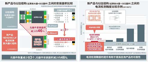 近年來(lái),越來(lái)越多的應(yīng)用產(chǎn)品需要具備電流檢測(cè)功能。例如,要想改善電機(jī)效率和實(shí)現(xiàn)異常檢測(cè)等目標(biāo),就需要提高電流檢測(cè)精度。另外,還需要減少安裝面積。在以往結(jié)構(gòu)(運(yùn)算放大器+分立器件)中,存在元器件精度波動(dòng)和溫度特性導(dǎo)致電流檢測(cè)精度下降、很難縮小安裝面積等問(wèn)題。為了解決這些問(wèn)題,ROHM利用長(zhǎng)年積累的模擬技術(shù)優(yōu)勢(shì),開(kāi)發(fā)出更節(jié)省空間且能高精度檢測(cè)電流的新產(chǎn)品“BD1421x-LA系列”。