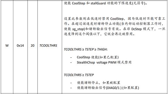 *TCOOLTHRS 0X14:使能CoolStep和StallGuard2功能的下限速度,到達(dá)此值電機(jī)停止并保持。