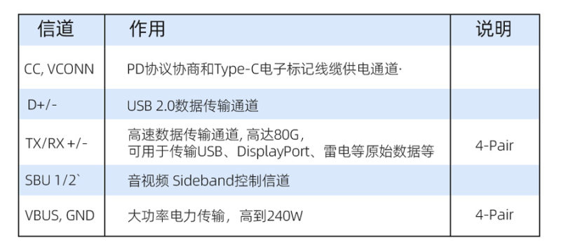 USB Type-C作為一種更為先進的物理接口,全功能滿PIN (24PIN)下可以提供多種控制及傳輸通道,在PD協(xié)議的配合下,可進行電力協(xié)商及接口工作模式的協(xié)商,從而啟用相應(yīng)的通道功能。