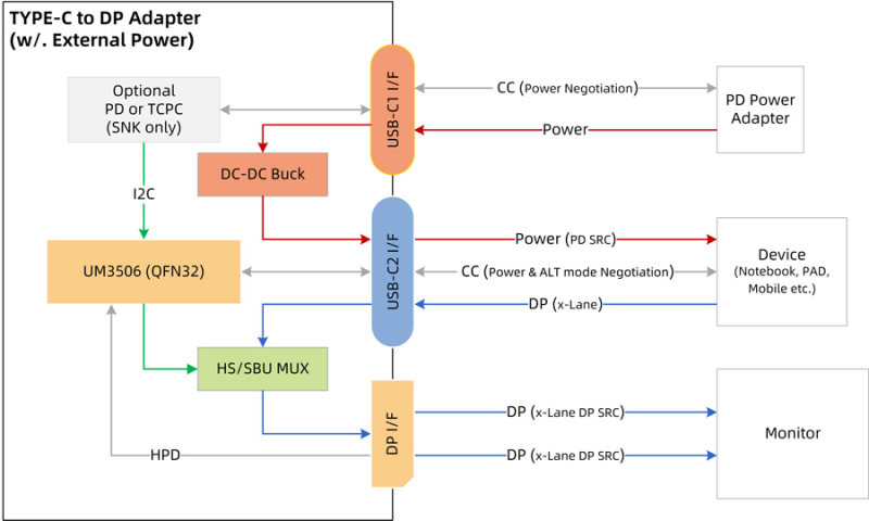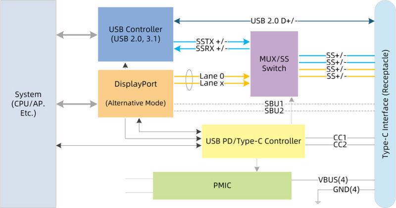 從以下的功能框圖看到,主機系統(tǒng)中USB和DP控制器,MUX/SS Switch,PD控制器,乃至電源控制器均是協(xié)同工作。其中的高速數(shù)據(jù)都是USB Host控制器以及 DP Source控制器的源格式。