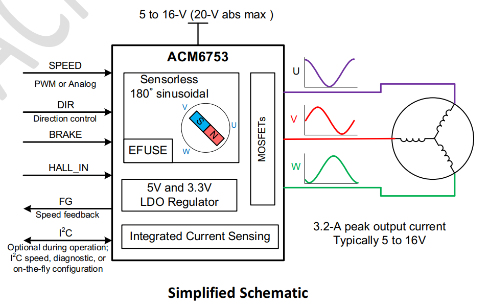 ACM6732是一款三相無(wú)刷直流電機(jī)驅(qū)動(dòng)芯片,內(nèi)部集成無(wú)感三相無(wú)刷電機(jī)驅(qū)動(dòng)算法、相電流檢測(cè)電流電路、柵極驅(qū)動(dòng)電路以及功率MOS 管. 支持最大2.4A的相電流. ACM6732 的高集成度以及精簡(jiǎn)外圍特別適用于高功率密度、小尺寸、靜音要求高的三相無(wú)刷電機(jī)驅(qū)動(dòng)器應(yīng)用場(chǎng)