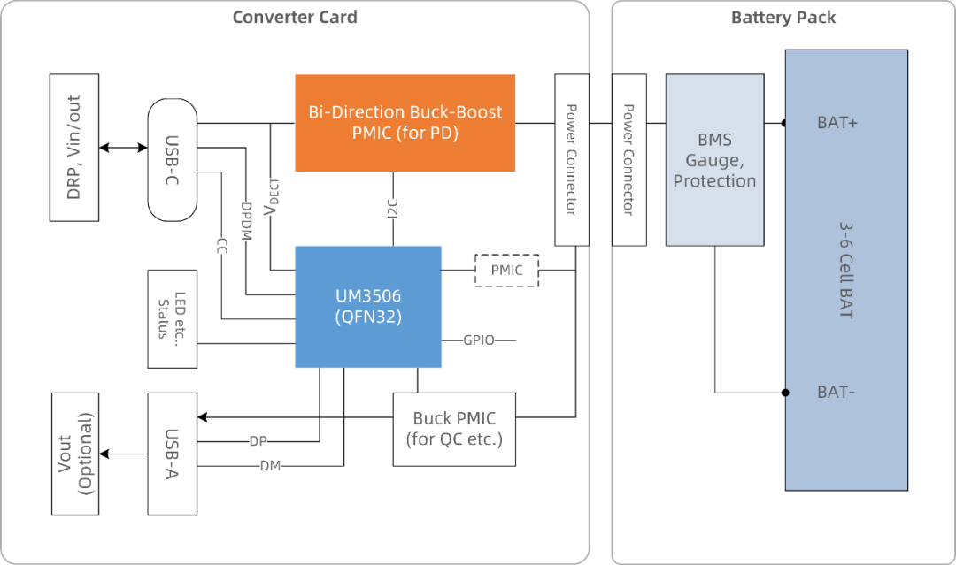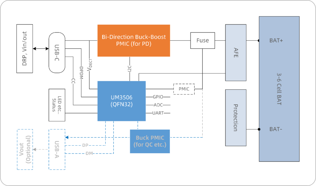 UM3506實(shí)現(xiàn)PD DRP協(xié)議,電源管理,并可與外置的電池包上的BMS進(jìn)行通信,支持私有協(xié)議監(jiān)控電芯狀態(tài),確保充放安全
