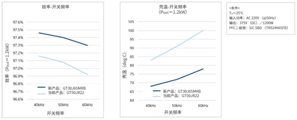 對于使用東芝當(dāng)前產(chǎn)品GT50JR22的空調(diào)PFC電路,其工作頻率低于40kHz[6]。而GT30J65MRB是東芝首款用于60kHz[6]以下PFC的IGBT,其可通過降低開關(guān)損耗(關(guān)斷損耗)來確保更高的工作頻率。