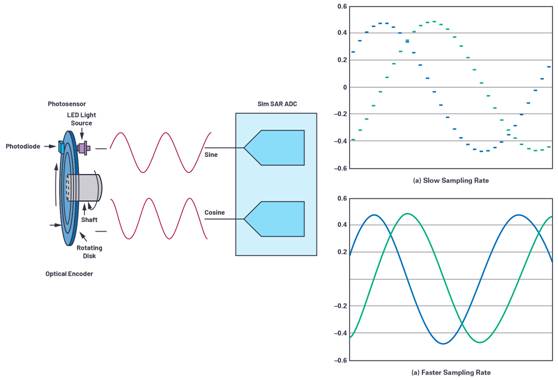 ADC 將使我們能夠創(chuàng)建更高分辨率的編碼器,而無需對編碼器盤進行系統(tǒng)更改。例如,當以較慢的速率對編碼器正弦和余弦信號進行采樣時,捕獲的信號值較少,如圖 3