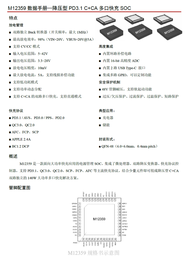 M12359是一顆C+CA三口快充140W PD3.1獨立降壓的SOC芯片。三口都支持快充。芯片兩個C口都兼容PD3.0/PPS,并擴展支持PD3.1協(xié)議的28V/5A固定PDO和15~28V@5A的AVS功率輸出。這也是目前行業(yè)唯一支持3口快充的單芯片方案,集成度和體積優(yōu)勢無與倫比。