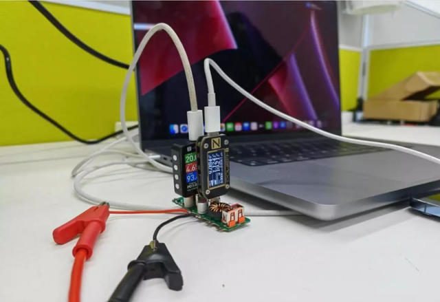 C1插入蘋果筆記本,C2口插入蘋果13,C1口輸出功率100W,C2口最大輸出功率18W。
