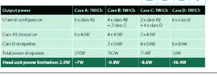 使用六個 AB 類放大器通道將導(dǎo)致總功耗為 27W——比通常認(rèn)為的音響主機的值多 7W,如表中的 A 所示。