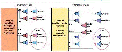 添加兩個通道可以解決幾個問題。首先,它允許大功率低音揚聲器通過兩個新通道獨立驅(qū)動至汽車前排座椅下方的揚聲器。消除門共振。更高的聲音保真度也是可能的,因為所有的揚聲器都沒有義務(wù)在整個頻率范圍內(nèi)工作。