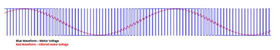用于降低電機控制應(yīng)用中可聞噪聲的第一種策略是連續(xù) PWM。PWM 是一種技術(shù),通過導(dǎo)通和關(guān)斷晶體管來產(chǎn)生輸出波形,從而讓電機電壓在給定時間處于高電壓或低電壓狀態(tài)。然后,電機中的電感對這些波形進行濾波,以便基本上平均輸出波形。調(diào)整占空比(波形導(dǎo)通時間與關(guān)斷時間之比)將改變平均電壓。圖 2 展示了使用 PWM 生成正弦波的一個示例。