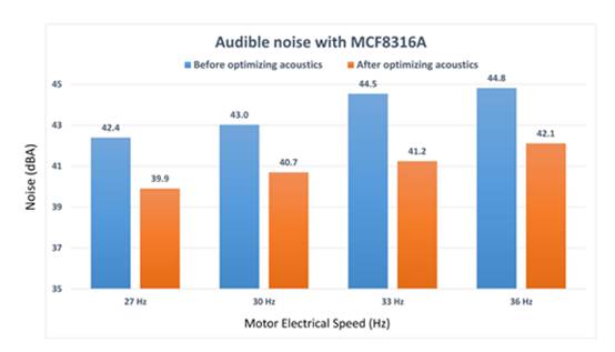 例如,TI 無傳感器 BLDC 集成梯形控制柵極驅(qū)動器(如 MCT8329 和 MCT8316)采用此內(nèi)置功能來優(yōu)化多種電機頻率下的聲學(xué)性能,如圖 9 所示。