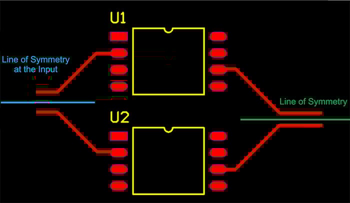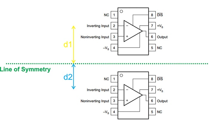 但是,非對稱包不是這種情況。例如,考慮一個采用 SOIC-8 封裝的運算放大器。如圖 7 所示,相對于一條對稱線放置其中兩個封裝不會創(chuàng)建對稱布局。在此示例中,與下部運算放大器的反相輸入相比,上部運算放大器的反相輸入更遠離對稱線。換句話說,d1 > d2。
