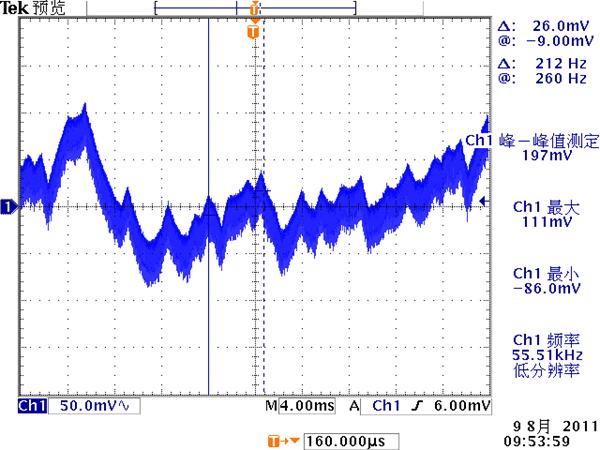 低頻紋波是與輸出電路的濾波電容容量相關。由于開關電源體積的限制,電解電容的容量不可能無限制地增加,導致輸出低頻紋波的殘留,該輸出紋波頻率隨整流電路方式的不同而不同。
