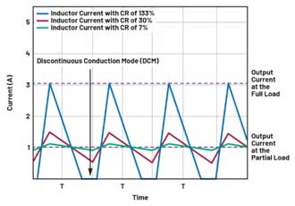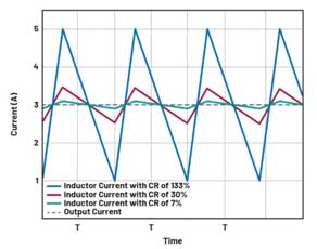 圖2中,紅色線條表示電路的電感電流紋波(電流紋波比(CR)為30%,輸出電流為3A。這是開關(guān)穩(wěn)壓器電路設(shè)計(jì)中常見(jiàn)的折衷選擇。藍(lán)色波形對(duì)應(yīng)的電感電流紋波為133%,綠色波形對(duì)應(yīng)的電感電流紋波為7%。