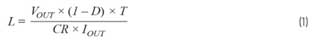此公式基于電流紋波比CR計(jì)算降壓轉(zhuǎn)換器所需的電感值L。該比值一般指定為0.3,或30%峰峰紋波。在該公式中,D表示占空比,T表示周期時(shí)間,取決于各自的開關(guān)頻率。