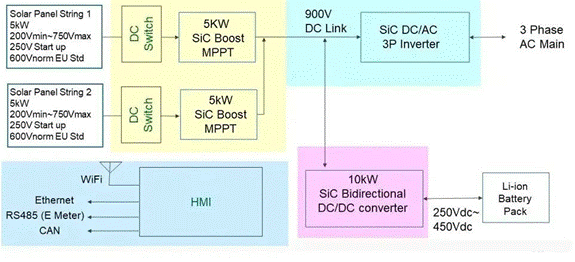 以10kw太陽能儲能系統(tǒng)為例,由艾睿電子推出的這款10kW DC/AC三相光伏逆變器將帶電池組和雙向充電系統(tǒng),主要由4個模塊組成,包括3相T型DC-AC逆變器塊、最大功率點跟蹤(MPPT)升壓模塊、雙向電池充電系統(tǒng)與人機界面(HMI)模塊等組成,可加速客戶的產品開發(fā)設計。
