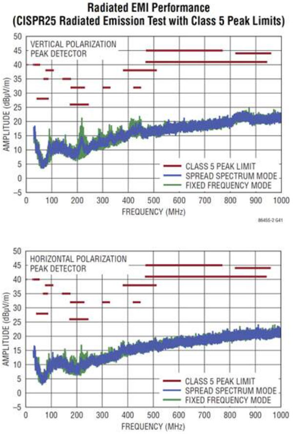 為了抑制熱回路,Silent Switcher 設(shè)計(jì)將熱回路分為兩個(gè)均衡回路,使得它們的電流可以有效地相互抵消。為了解決走線(xiàn)電感問(wèn)題,在芯片上集成旁路電容器,避免與印刷電路板走線(xiàn)電感和瞬時(shí)振蕩有關(guān)的問(wèn)題,同時(shí)通過(guò)消除外部元器件及其貼裝的可變性確保性能。這種做法讓輻射放射性能能夠輕松達(dá)到 CISPR 25 標(biāo)準(zhǔn)限值(圖 3)。
