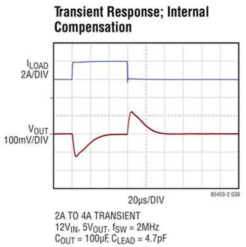 這些開(kāi)關(guān)穩(wěn)壓器的設(shè)計(jì)還能夠改進(jìn)瞬態(tài)響應(yīng)。它們提供清晰、精密的調(diào)節(jié)(盡管負(fù)載變化),并可在各種不同工作條件下保持回路穩(wěn)定性(圖 4)。為了增加靈活性,LT8646S 器件還允許外部電阻-電容器 (RC) 補(bǔ)償,讓設(shè)計(jì)人員能夠優(yōu)化瞬態(tài)響應(yīng)。