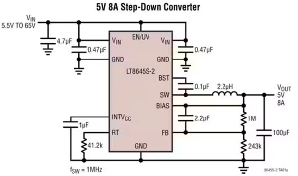 但是,隨著最近的技術(shù)進(jìn)步和創(chuàng)新拓?fù)浣Y(jié)構(gòu)的問(wèn)世,這種情況已經(jīng)改變,LT8645S、LT8646S 和 LT8645S-2 就證明了這一點(diǎn)。這三款相似的 65 V 單片 Silent Switcher 同步降壓穩(wěn)壓器來(lái)自于 Analog Devices,每款穩(wěn)壓器都能夠支持 8 A 輸出(圖 1)。