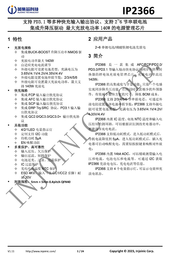 近日,作為國內(nèi)電源管理芯片領(lǐng)域的知名廠商,英集芯響應(yīng)市場潮流趨勢,針對鋰電池及磷酸鐵鋰電池應(yīng)用,推出IP2366電源管理芯片,支持PD3.1快充協(xié)議,最大充放電功率達(dá)140W,支持輸入輸出雙向快充。