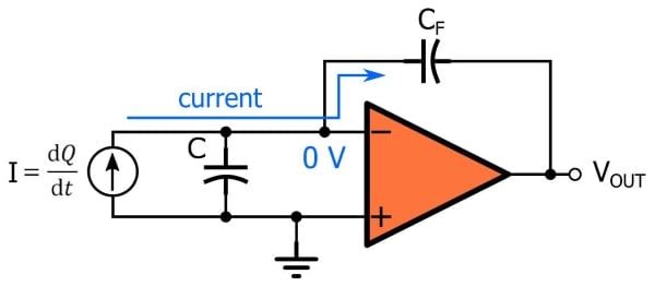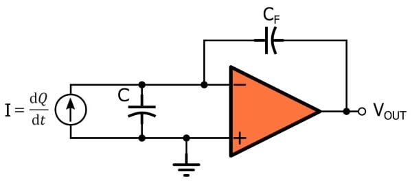 跨阻放大器接受輸入電流并將其乘以反饋路徑中的電阻,這不僅會(huì)增加幅度,還會(huì)將電流轉(zhuǎn)換為電壓。電荷放大器做類似的事情,但在反饋路徑中使用電容而不是電阻產(chǎn)生的輸出不與瞬時(shí)電流成比例,而是與電流隨時(shí)間的累積成比例。換句話說,輸出告訴我們一些關(guān)于電流積分(相對(duì)于時(shí)間)的信息,而不是給定時(shí)刻電流的大小。
