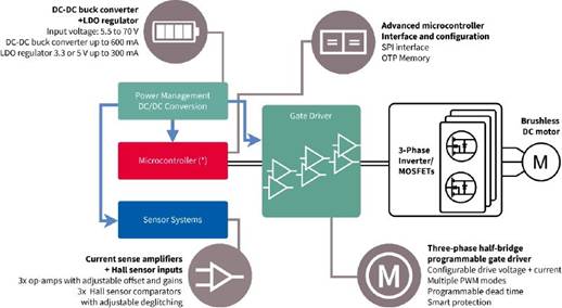 新型三相智能電機驅(qū)動器 IC 支持使用無刷直流 (BLDC) 或永磁同步 (PMS) 電機開發(fā)高性能電機驅(qū)動器。這些設(shè)計特別適用于移動機器人、無人機和電動工具應(yīng)用。