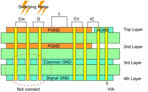 此外,如果在第三層上有公共接地,在第四層上有信號(hào)接地,則電源接地與第三和第四層接地之間的連接僅連接高頻開關(guān)噪聲較小的輸入電容器附近的電源接地。切勿連接噪聲多的輸出或續(xù)流二極管的電源接地。參見下面的截面示意圖。