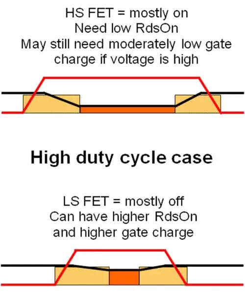 低占空比設計意味著高輸入電壓,對這些設計而言,高側 FET 大多時候均為關斷,因此 DC 損耗較低。但是,高 FET 電壓帶來高 AC 損耗,所以可以選擇低柵極電荷的 FET,即使導通電阻較高。低側 FET 大多數(shù)時候均為導通狀態(tài),但是 AC 損耗卻。這是因為,導通/關斷期間低側 FET 的電壓因 FET 體二極管而非常地低。因此,需要選擇一個低導通電阻的 FET,并且柵極電荷可以很高。圖 7 顯示了上述情況。