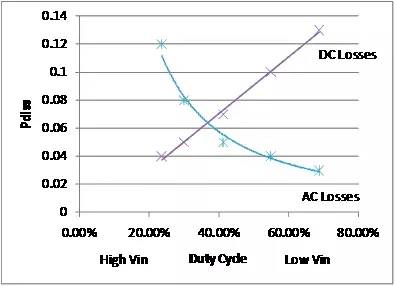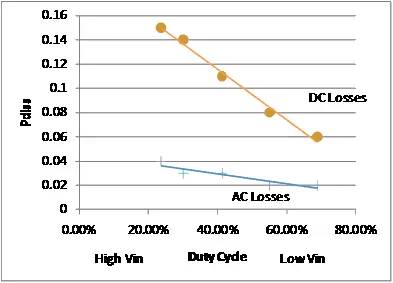 圖 9 中,高側 FET 反應曲線圖表明,占空比從 25% 增至 40% 時 AC 損耗明顯降低,而DC 損耗卻線性增加。因此,35% 左右的占空比,應為選擇電容和導通電阻平衡FET的理想值。不斷降低輸入電壓并提高占空比,可以得到的AC 損耗和的 DC 損耗,就此而言,我們可以使用一個低導通電阻的 FET,并折中選擇高柵極電荷。如低側 FET 圖 10 所示,控制器占空比由低升高時 DC 損耗線性降低(低側 FET 導通時間更短),高控制器占空比時損耗。整個電路板的AC 損耗都很低,因此任何情況下都應選擇使用低導通電阻的 FET。