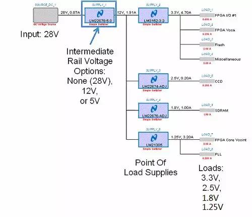 圖 12—表明輸入、中間軌、負載點 (POL) 電源和負載的電源系統(tǒng)。中間軌電壓的不同選擇為 28V(直接使用輸入電源)、12V 和 5V。這會帶來不同的 POL 穩(wěn)壓器占空比。